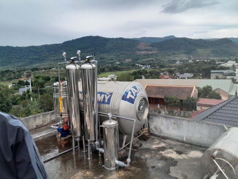 Nước được máy bơm hút từ bể lắng sẽ dẫn sang bể lọc theo đường ống nhựa, trong bể lọc được bố trí lơp vật liệu lọc sẽ giúp giữ lại các hạt cặn lơ lửng có trong nước giếng khoan, ngoài ra lớp vật liệu lọc còn có khả năng hấp phụ giúp giữ lại các hạt cặn có kích thước siêu nhỏ trên bề mặt lớp vật liệu lọc. Lớp vật liệu lọc được bố trí theo đặc trưng nguồn nước giếng khoan. Sau khi đi qua bể lọc thô nước được dẫn sang bể lọc số 2 đây được coi là bể lọc tinh giúp xử lý một lần nữa giúp cho nước có chất lượng tốt hơn và đảm bảo hơn để sử dung. Dưới tác dụng của lớp vật liệu lọc bể lọc số hai sẽ tiếp tục xử lý một lần nữa giúp cho nguồn nước luôn sạch và đảm bảo. Sau khi qua bể lọc số hai sẽ được dẫn sang bể lọc cặn sử dụng lõi lọc bông giúp loại bỏ các cặn lơ lửng có kích thước lớn hơn 5micron.