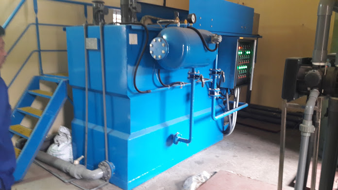 Nước được máy bơm chìm đưa lên bể phản ứng ở đây nước thải được cung cấp hóa chất PAC nhằm tạo phản ứng kết tủa, dưới tác dụng của máy khuấy đặt cạn toàn bộ lượng hóa chất cung cấp được hòa trộn động đều với nước nguồn, sau khi đi qua bể phản ứng PAC sẽ được dẫn sang bể phản ứng Polymer dưới tác dụng của máy khuấy phản ứng hóa chất polymer được hòa trộn vào trong nước giúp tạo thành các bông cặn có kích thước lớn hơn nhiều so với hòa trộn với PAC, nước thải sau khi đã được ngậm đầy hóa chất nươc thải được dẫn sang bể tuyển nôi. Bể tuyển nổi được cung cấp khí tươi có kích thước siêu nhỏ giúp đẩy các cặn bẩn có dầu nổi lên bề mặt bể tuyển nổi. Lượng cặn bẩn nổi lên được máy gạt váng đưa vào ngăn chứa bùn, lượng bùn này được xử lý theo định kỳ. Lượng nước sạch được đưa vào ngăn lấy nước sạch đưa vào bể trung gian.
