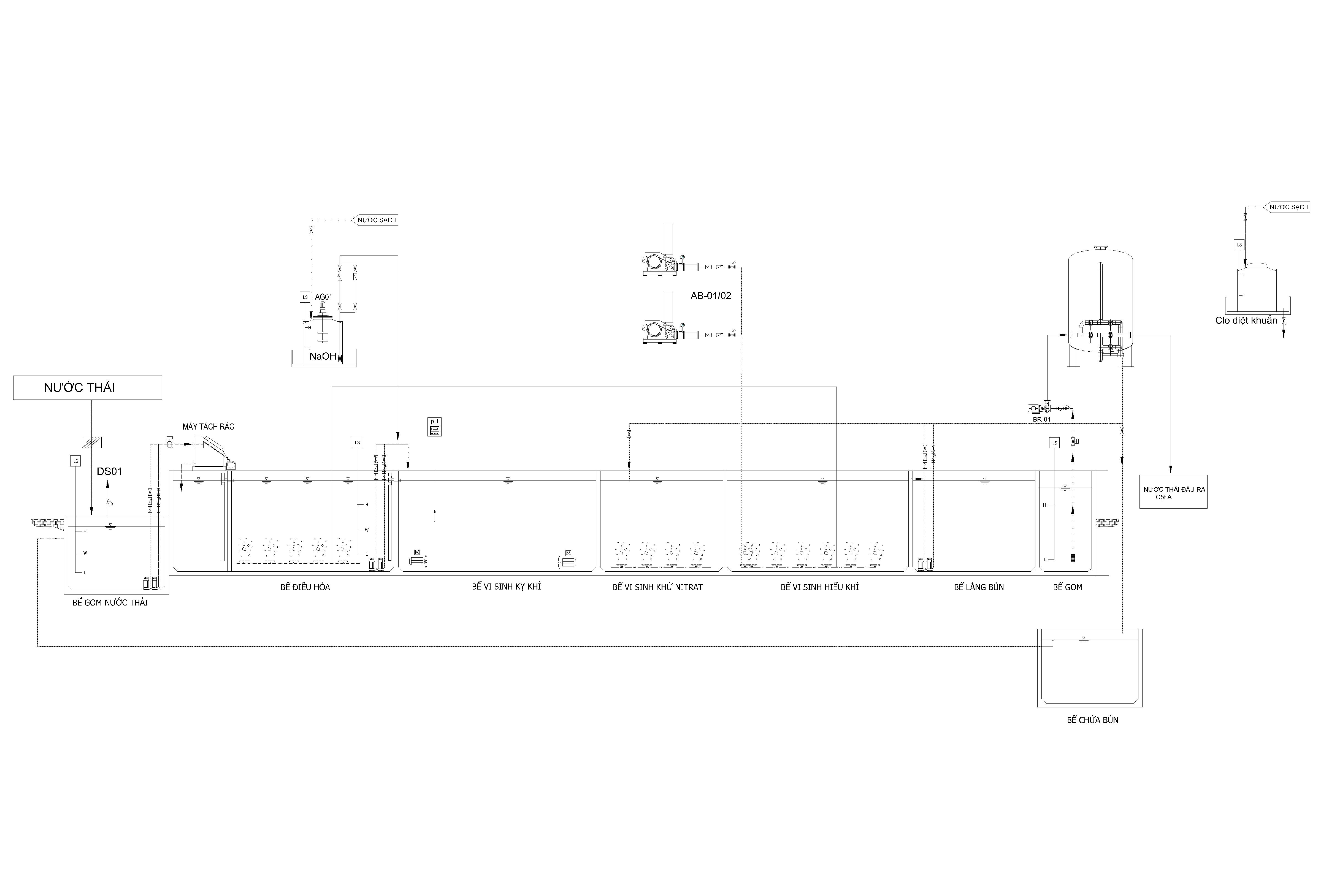 Nước thải sinh hoạt ==> Bể phốt ==> Bể gom nước thải ==> Bể điều hòa lưu lượng ==> Bể sinh học kỵ khí ==> Bể sinh học khử nitrat ==> Bể sinh học hiếu khí ==> Bể lắng bùn ==> Bể chứa trung gian ==> Bể lọc áp lực ==> Bể khử trùng ==> Xả thải ra môi trường.